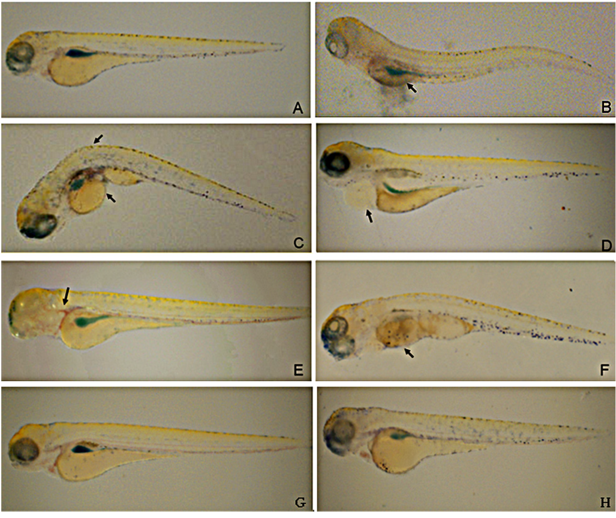 The induction of LPS on inflammation phenotype in zebrafish. The yolks of zebrafish larvaes were injected with 0.5 mg/mL LPS to induce reproducible morphological abnormalities at 24 h. Figure B–F present the observed morphological abnormalities. (B) Necrotic yolk; (C) yolk crenulation and cyrtosis; (D) swollen pericardium sac; (E) hemorrhagic pericardium; (F) death. (A) PBS injection was used for negative control while (G) un-treated zebrafish larvaes served as normal control. Larvae exposed to 0.5 mg/mL LPS by immersion for 24 h (H). The representative images have been taken from three individual experiments (n = 34).