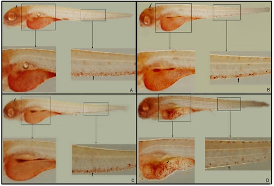 The macrophages that arise from the anterior lateral plate mesoderm are capable of phagocytosing cellular debris, apoptotic cell corpses, and microbes. These macrophages can be injected into the blood circulation or into one of the closed body cavities, such as the hindbrain ventricle [23,24]. Macrophages stimulate lymphocytes and other immune cells to respond to pathogens, for instance, via the regulation of TNF-α, IL-1, and IL-6. Macrophage lysosomes fuse to form a single large, red vacuolar aggregate, allowing easy detection of these cells in the larvae by NR staining [25]. Larvae used for NR staining studies were treated at 3-dpf and sampled at 4 hpi or hpe. In 3.5-dpf larvae, macrophages predominantly appeared in the midbrain region and blood islands (PBI; Figure 2A,C arrow). In LPS-immersed larvae, no abnormal red vacuolar aggregates (i.e., macrophages) were observed in non-yolk larval tissues (Figure 2B) when compared with the microinjection of PBS (Figure 2C). However, in larvae microinjected with LPS, large red vacuolar aggregates appeared in the yolk sac, with almost no staining in the PBI (Figure 2D, arrow). Thus, macrophages appear to leave the brain and PBI and migrate to the inflammatory foci in the yolk of LPS-injected larvae. These findings demonstrated that LPS could induce the inflammatory responses in zebrafish larvae and the injection was more suitable for the induction of inflammation responses in zebrafish larvae.