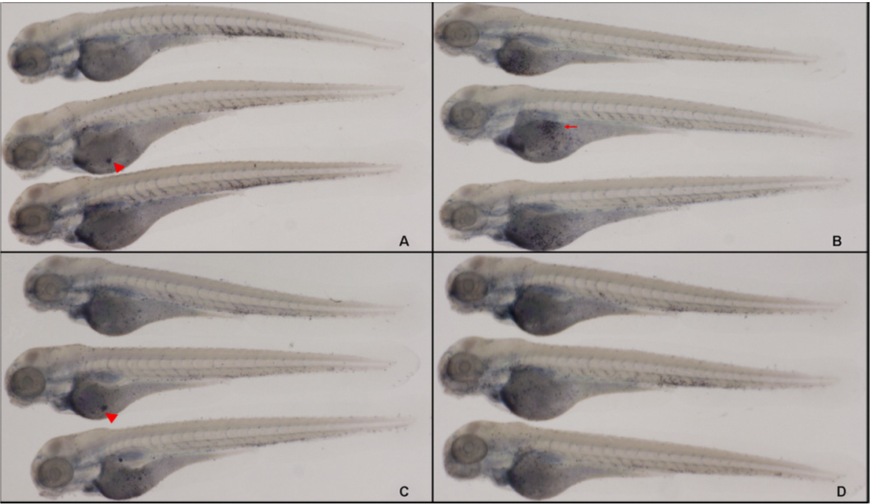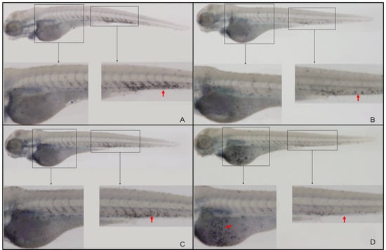 Representative pictures of SB labeling of neutrophils at 3 dpf. (A) Normal controls; (B) larvae immersed in LPS (0.5 mg/mL); (C) PBS-injected negative controls; and (D) larvae with LPS (0.5 mg/mL) injected into the yolk (n = 34).
