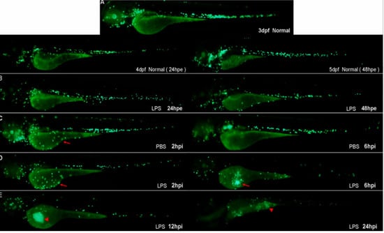 Neutrophil infiltration is characteristic of acute inflammation. It has been reported that wounding induces the recruitment of neutrophils from the vasculature to the wound site. The majority of neutrophils that enter the wound quickly return to the vasculature, while a minority migrate around the wound site, then return to the vasculature after inflammation regresses [17,28]. Using the MPO:GFP line [17], no abnormal recruitment of neutrophils was observed in LPS-immersed larvae within 48 hpe compared with controls (Figure 4B). A few neutrophils were found at the wound at 2 hpi in the PBS-injected negative controls and LPS-injected larvae (Figure 4C,D arrow). At 6 hpi, neutrophils migrated from the wound site back to the vasculature in PBS-injected larvae (Figure 4C). However, in LPS-injected larvae, neutrophils were robustly retained at the injection site (Figure 4D, arrow). LPS doses below 0.125 mg/mL produced similar results (data not shown). By 12–16 hpi, a fluorescent signal circled the neutrophil recruitment site (Figure 4E, arrowhead). By 18–24 hpi, most of the larvae showed yolk necrosis, including a few deaths (Figure 4E, arrowhead).