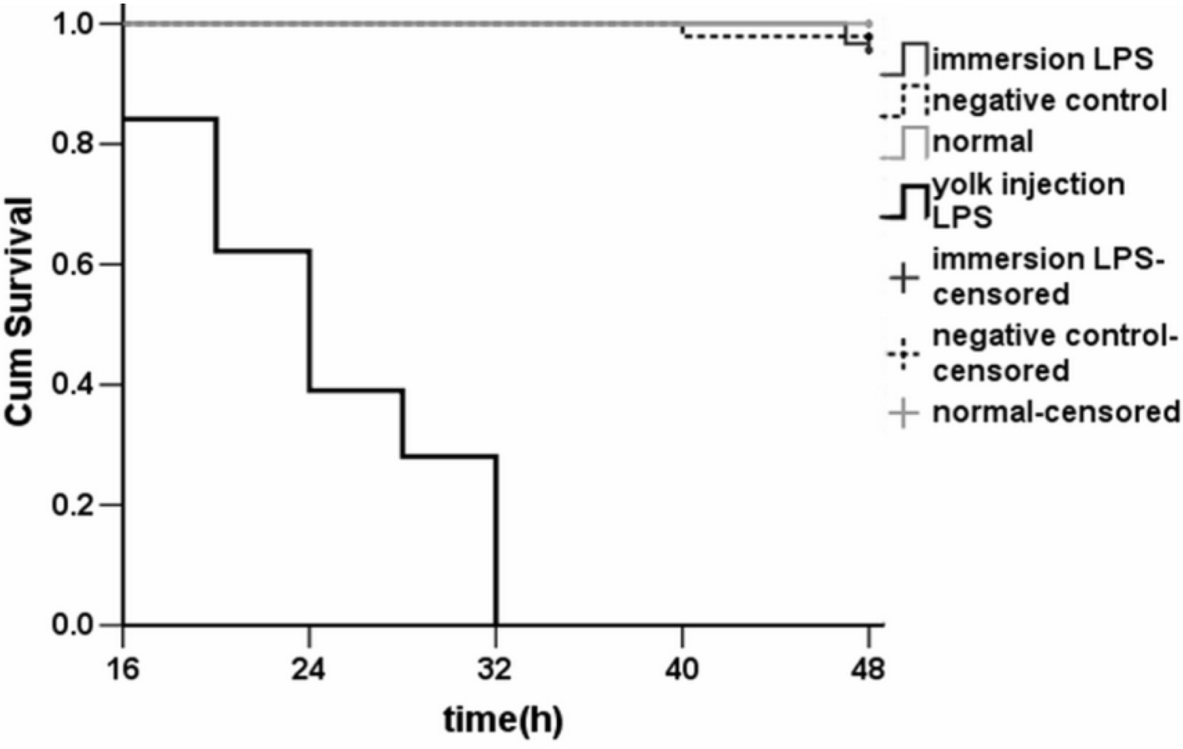 Two hundred zebrafish larvae from the same mother were randomly divided into four groups: PBS-injected negative controls, and larvae injected with LPS at 3, 5, and 6-dpf (50 larvae per group). 0.5 mg/mL LPS (2 nL) was injected into the yolk of each larva. Larvae were then cultured at 28.5 °C and observed for signs of disease and mortality for 48 h.