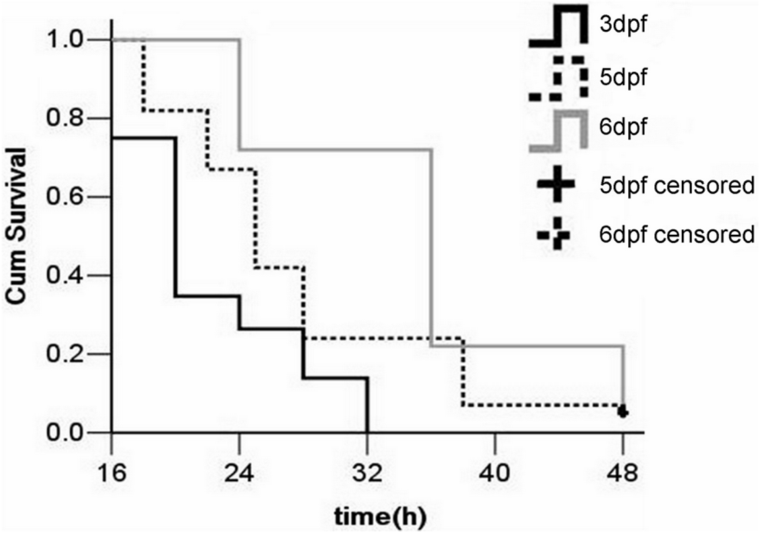 Zebrafish neutrophils and arch-macrophages can be detected as early as 18 h post-fertilization (hpf). In the phylotypic-stage (24–48 hpf), the integral blood circulation and a natural immune system in zebrafish have been developed. The components of acquired immunity and primary organs were formed in the hatching stage (48–72 hpf) [23,30,31]. To determine the optimal stage for injection, identical doses of LPS were injected into the yolk at different larval stages (Figure 6). Injections at 3-dpf caused 100% mortality at 32 hpi, while injections at 5- and 6-dpf caused 94% mortality at 48 hpi. All PBS-injected larvae survived (data not shown). The median survival times of larvae injected at 3, 5, and 6-dpf were 20 ± 0.6, 25 ± 0.8, and 36 ± 1.4 h, respectively. The p-values for the statistical tests and multiple comparisons were all below 0.001. It suggested that the survival time of the LPS-injected zebrafish larvae increased with the stage at which they were injected. Performing injections at 3-dpf is therefore preferable, as this stage adequately models the immune response but shortens the time required for the experimental analysis.