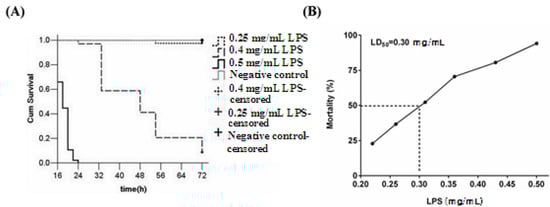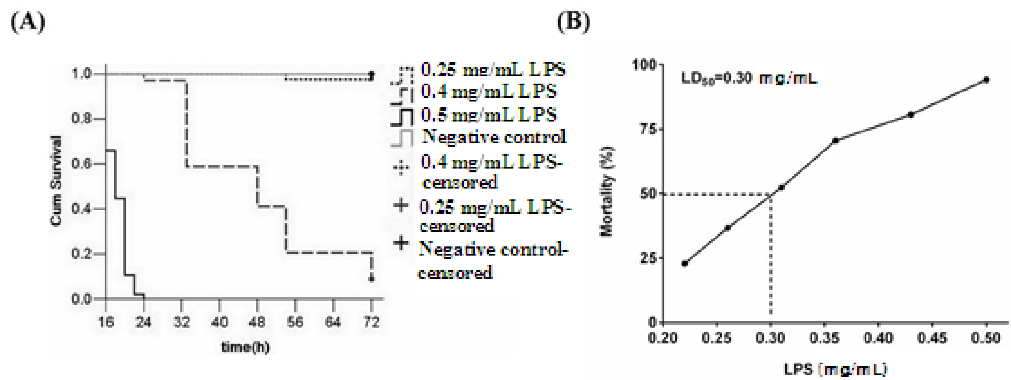 In preliminary experiments, zebrafish larvae were injected with 0.25, 0.4, or 0.5 mg/mL LPS. The concentration of LPS that elicited 50% mortality (LD50) was calculated by nonlinear regression: