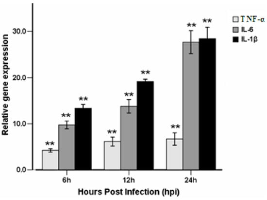 Effect of injection time for the genes expressions of inflammation cytokines by RT-PCR. Expressions of TNF-α, IL-6, and IL-1β gene in 0.5 mg/mL LPS-infected larvae compared with controls determined by quantitative real-time PCR. Larvae were injected with 0.5 mg/mL LPS at 3 dpf. Total RNA was extracted from larvae at 6, 12, and 24 hpi. Each bar represents the mean of three replicates. Error bars represent standard deviation.