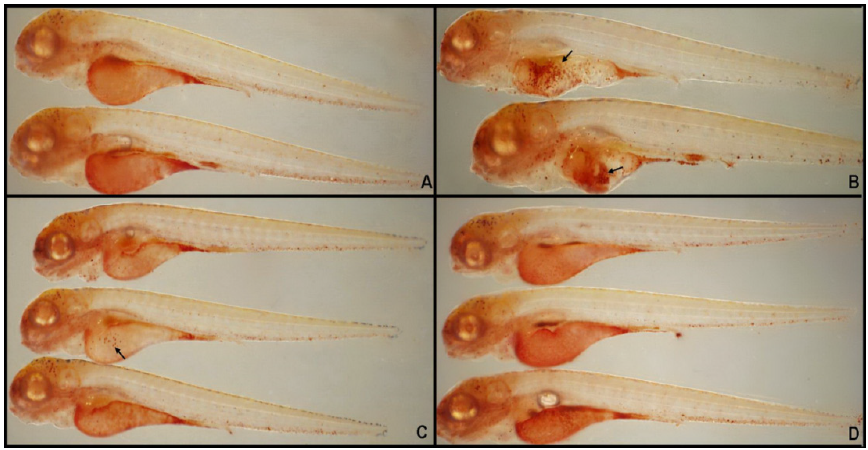 Studies have shown that the immune system of zebrafish was remarkably similar to that of humans [35,36,37], displaying similarities in inflammatory responses, including vascular cell migratory/phagocytic processes, and inflammatory factors. Pathological immunocyte migration is an important sign of an inflammatory response. Therefore, the migration of phagocytes can be visualized using a simple staining protocol in zebrafish or transgenic lines. These monitoring systems are both convenient and inexpensive. Using mortality as a primary end-point is also extremely useful and easily scored. This approach is rapid, cheap, and efficient.