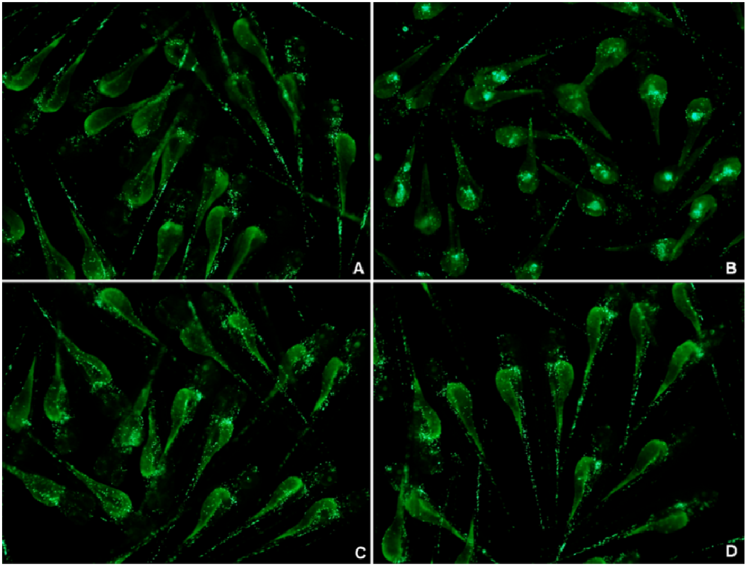 Representative pictures of MPO:GFP lines reveal the LPS-modeled infection process at 3 dpf. (A) Normal controls (untreated with any agents or operation); (B) larvae immersed in LPS (0.5 mg/mL); (C) PBS-injected negative controls; and (D) larvae with LPS (0.5 mg/mL) injected into the yolk (n = 34).