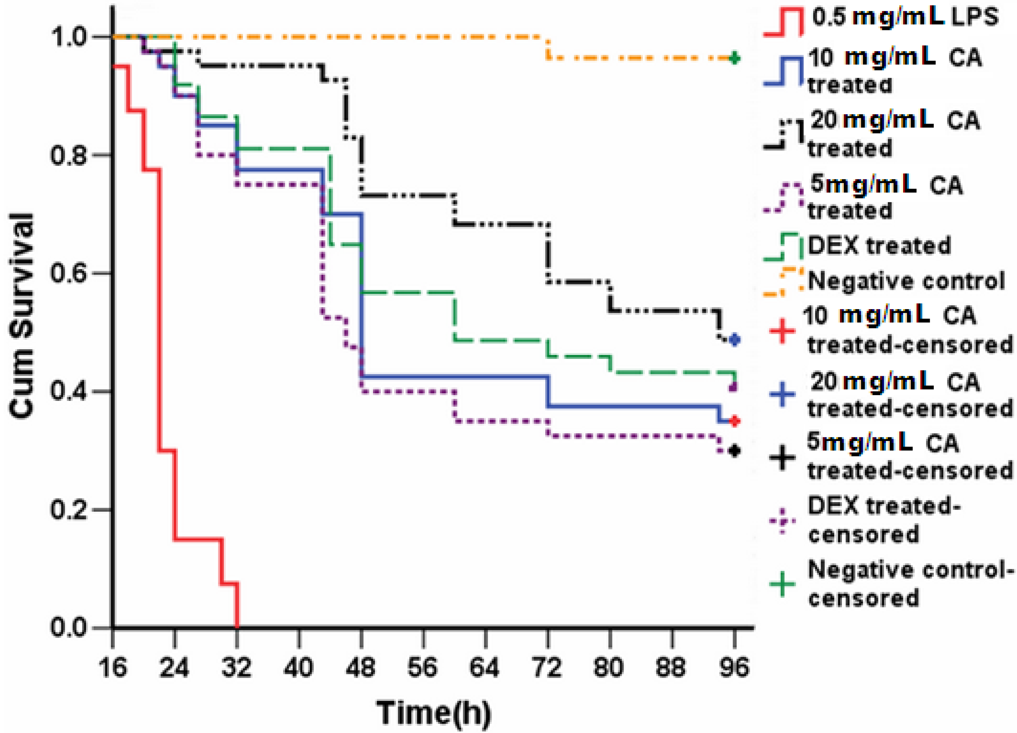 Protective effect of CA (20 mg/mL) on 3-dpf zebrafish larvae challenged with LPS. Three-hundred larvae were randomly divided into six groups (n = 50). The yolks of larvae were injected with 0.5 mg/mL LPS at 3-dpf and treated with the indicated doses of CA. Mortality was monitored for 96 h. Negative controls were injected with PBS. Each curve represents data pooled from three independent experiments.