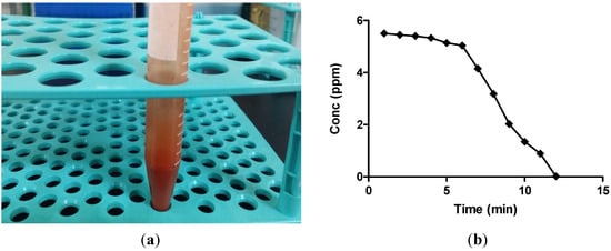 (a) Photograph of biosynthesized selenium nanoparticles; (b) AAS graph of selenium ion concentration.