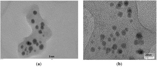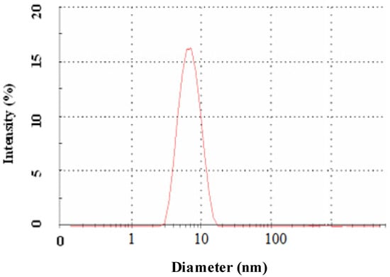 Further, the size and morphology of the biosynthesized selenium nanoparticles were characterized. TEM images of the prepared selenium nanoparticles showed a uniform distribution and confirmed their spherical morphology. The depicted ball-like structure of the selenium nanoparticles in the TEM images ranged in size from 3–18 nm in diameter. Figure 2a,b shows selenium nanoparticles at 5 nm and 20 nm scale, respectively. In the figures a thin film encapsulating the nanoballs is seen, confirming the presence of a polymeric layer covering the nanoballs. Figure 3 shows the DLS measurement of the hydrodynamic effective diameters of the biosynthesized selenium nanoballs [15]. The zeta average diameter was measured to be 8.12 ± 2.5 nm with 0.212 PDI. The disagreement between the sizes observed by TEM and DLS was due to the fact that DLS measures the hydrodynamic volume while TEM analyzes the metallic core [16].