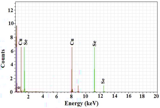 The energy dispersive X-ray spectroscopy analysis confirmed the presence of elemental selenium nanoparticles in the given sample, as depicted by Figure 4. The selenium nanoballs showed characteristic absorption peaks of selenium at 1.37 keV (SeLα peak), 11.22keV (SeKα peak) and 12.49 keV (SeKβ peak) [17]. The maximum peak located on the left part of the spectrum at around 0.2 kV clearly indicates the presence of carbon, while the hardly visible maximum located at 0.5 keV is associated with the characteristic oxygen line. Copper peaks were also visible in the EDX spectra which were due to the Cu support grid. The lack of other elemental peaks and high amount of selenium in the spectra confirms the purity of the selenium metal in the transformed product. The presence of carbon and oxygen spots in the samples confirms the presence of stabilizers composed of alkyl chains.