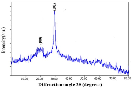 The crystalline nature of the selenium nanoballs was analyzed using X-ray diffraction. Figure 5 shows broad diffraction peaks at lower angles, hence confirming the amorphous/nano-crystalline nature of the sample [12]. The diffraction peaks were in accordance with the trigonal phase of selenium having lattice constants a = 4.362 Å and c = 4.958 Å, which corresponds to the reported value (JCPDS File No. 06-362). Full width at half maximum (FWHM) data was used to determine the particle size through Scherrer’s formula [18], and it was found to be 12 nm.