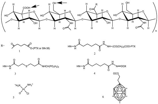 Boron neutron capture therapy is a promising approach for tumor therapy [49], but appropriate targeting is required to achieve boron concentrations that are sufficient to deliver therapeutic doses of radiation to the tumor, with minimal normal tissue toxicity (~20 μg/g tumor). Di Meo et al. proposed a bioconjugate (HApCB) composed of n-propyl carborane, linked to HA via an ester linkage, for a degree of substitution of approximately 30%; the result was a water-soluble derivative (Figure 1, R = 6). The structural and physicochemical characteristics of HApCB were described and its cellular uptake was evaluated in vitro on a variety of human tumor cells; HApCB produced high intracellular accumulation of boron atoms [50]. More recently, the same group prepared and characterized two new HA derivatives bearing carborane rings: hyaluronan-amidoazido-carborane, and hyaluronan-propargylamido-carborane both caused relevant amounts of boron atoms to accumulate intracellularly in a variety of cancer cells [51]. The principal characteristics of HA-drug conjugates have been summarized in Table 1.