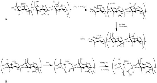 Synthetic scheme of hyaluronic acid-phospolipid- (A) and polyethyleneimine (B).
