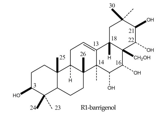 The EtOAc fraction was fractionated by chromatography over silica gel eluting with EtOAc, followed by increasing concentrations of methanol to yield five fractions. Successive column chromatographic purification of the second fraction (Fr.2) led to the isolation and characterization of a kind of sapogenin. The isolated compound was identified as R1-barrigenol (Figure 1) by comparison of its NMR spectrum with those of authentic samples and reference data [24].