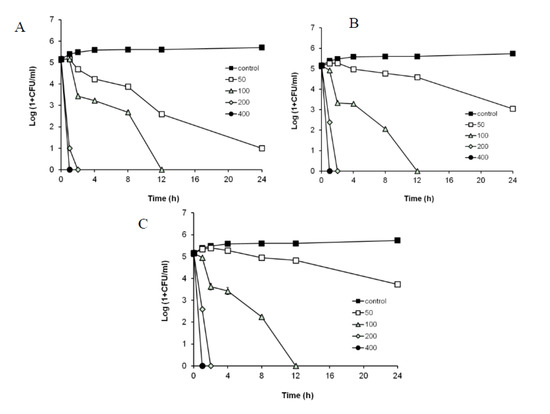 - Clinical and Laboratory Standards Institute (CLSI). Methods for Determining Bactericidal Activity of Antimicrobial Agents; In Approved Guideline, Document M26-A; CLSI: Wayne, PA, USA, 1999. [Google Scholar]
