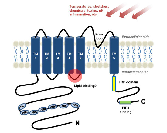 A topological structure of sensory TRP channels is illustrated. A subunit of the sensory TRP channels has six membrane-spanning (transmembrane) domains. Between TM5 and TM6 domains, the pore loop that allows ionic flow is located. Amino and carboxyl termini are located in the cytosol. Some of sensory TRPs contain multiple ankyrin repeats at their amino termini. One of important locations to interact with endogenous lipid regulators or lipophilic pharmacological agents (i.e., capsaicin) is predicted to be the TM4eTM5 linker. PIP2 may binds to C-termini of some TRP channels near the TRP domain.