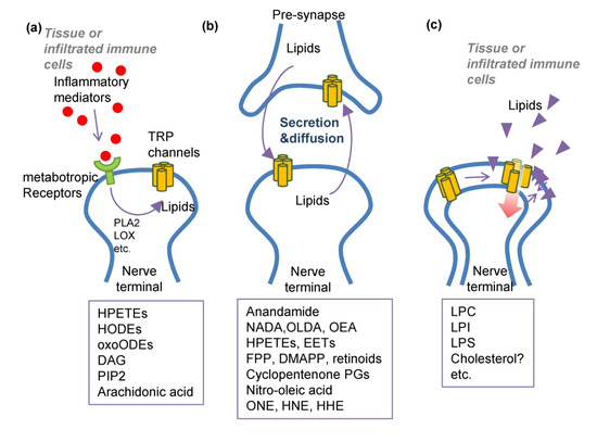 Above, we discussed internal generation of LOX metabolites as second messengers under control of upstream receptor signaling. This may occur in tissues surrounding C-fiber endings, infiltrated monocytes or neutrophils in the presence of inflammation or injury [139]. These substances can be excreted and diffuse around nerve endings like any other transmitter or mediator. It is also possible that the substances may flood the nerve so as to affect the nerve itself again or the neighboring terminal branches, which is indicative of a typical autocrine or paracrine effect. This kind of intercellular communication may contribute to exacerbation of TRPV1-related pain.