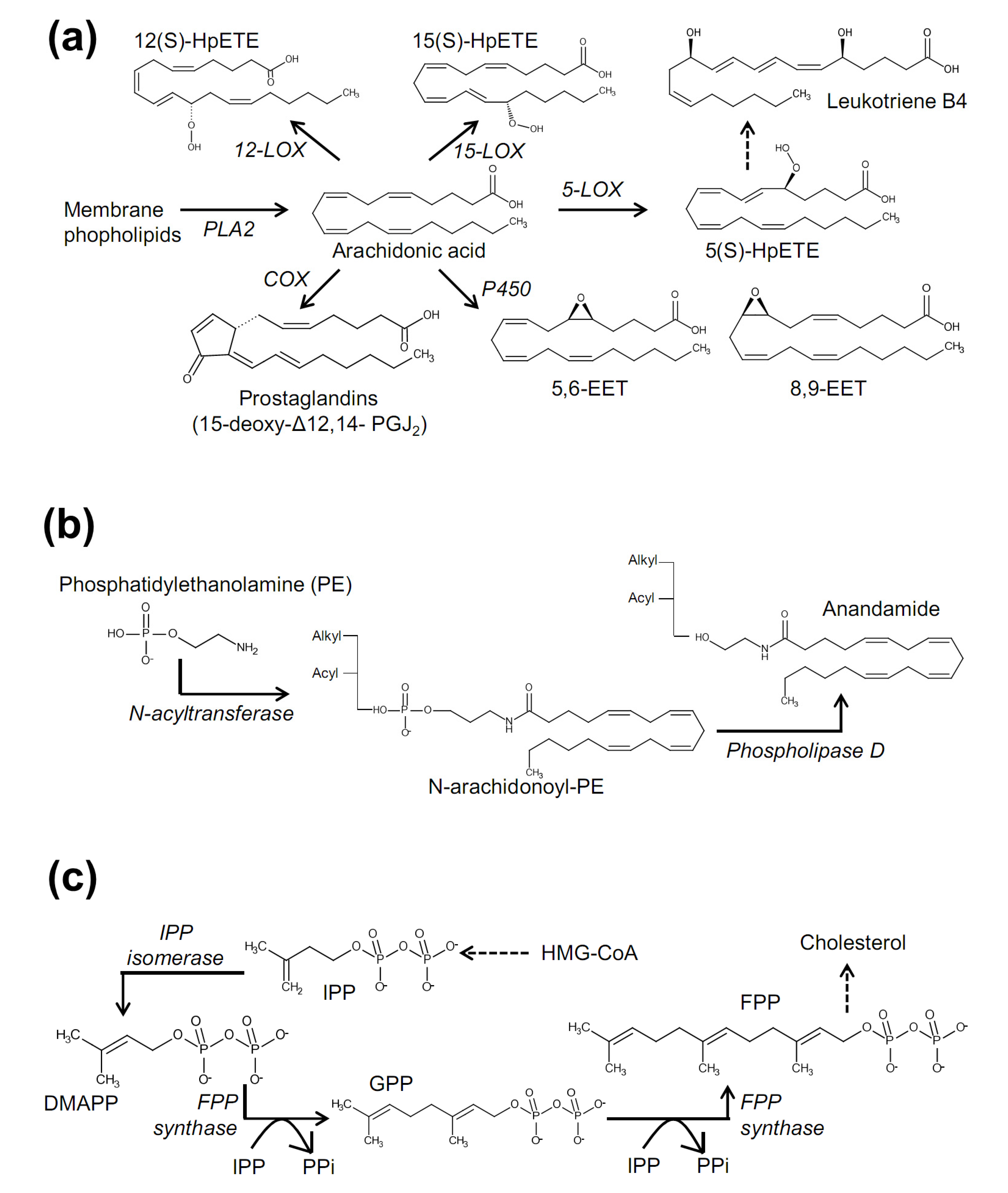 Biosynthetic pathways for HpETEs, EETs (a); anandamide (b); and isoprenoids (c), that are known to regulate activities of sensory TRP channels.