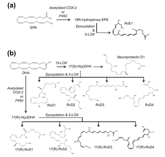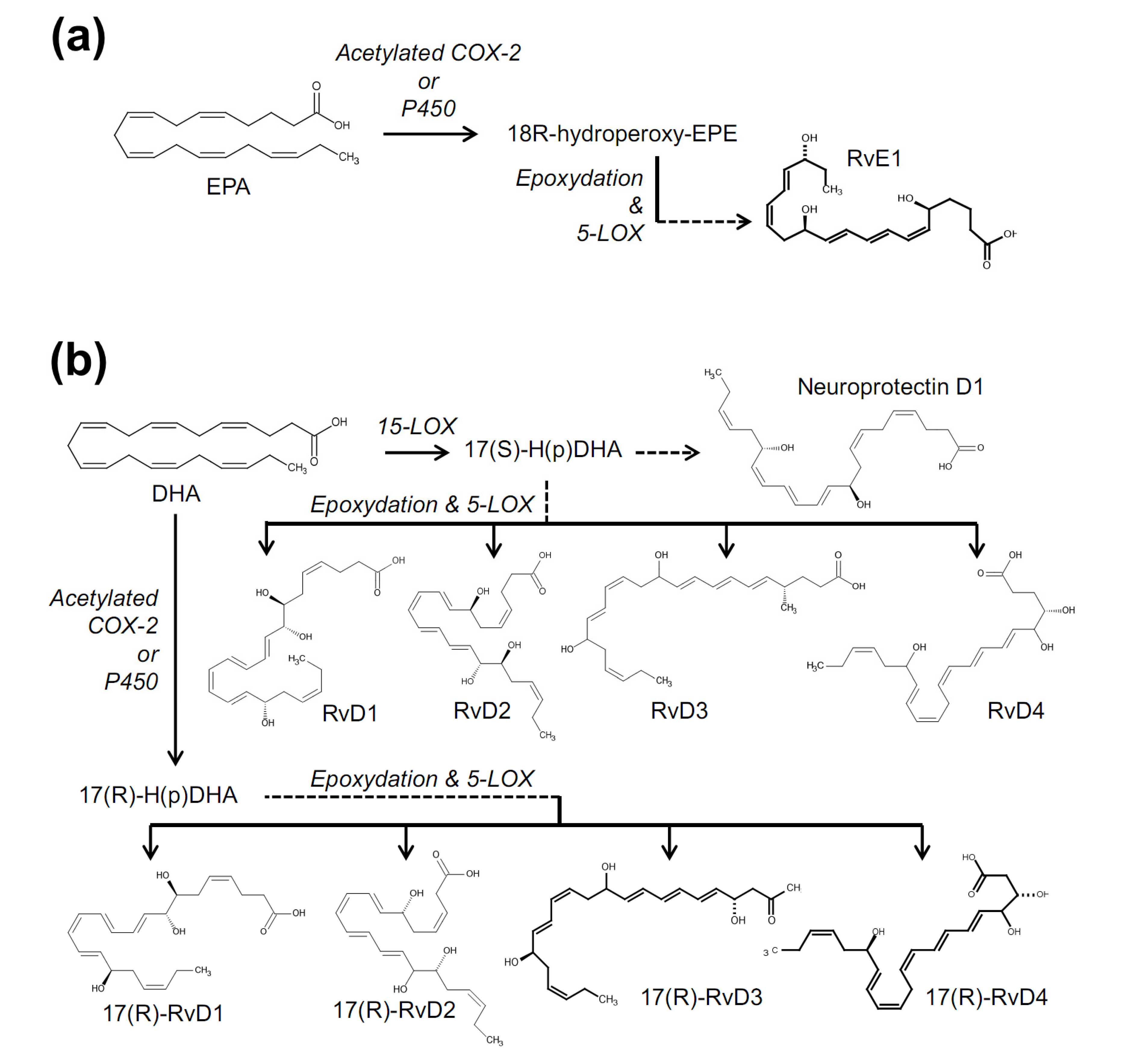 Biosynthetic pathways for resolvin E1 (RvE1) (a); and resolvin Ds (RvDs) (b).