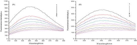 Fluorescence spectra of CYPs in the presence of various concentrations of puerarin (T = 303 K, concentrations of puerarin (1→9): 0, 0.5, 1, 1.5, 2, 2.5, 3, 3.5 and 4 × 10−5 mol L−1). (A) puerarin-CYP1A2; (B) puerarin-CYP2D6.