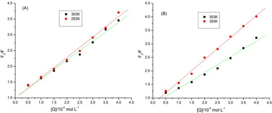 The apparent binding constant Ka and binding site n were calculated by plotting lg [(F0 − F)/F] vs. lg[Q] at different temperatures [13,14,15] (Table 2).