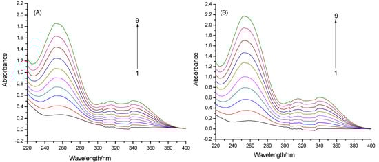 UV-vis spectra of CYPs with different concentrations of puerarin (concentrations of puerarin (1→9): 0, 0.5, 1, 1.5, 2, 2.5, 3, 3.5 and 4 × 10−5 mol L−1). (A) puerarin-CYP1A2; (B) puerarin-CYP2D6.