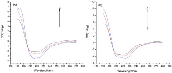 CD spectra of puerarin–CYPs in the absence and presence of increasing amount of puerarin (concentrations of puerarin (1→3): 0, 8 × 10−4 and 9 × 10−4 mol L−1). (A) puerarin-CYP1A2; (B) puerarin-CYP2D6.