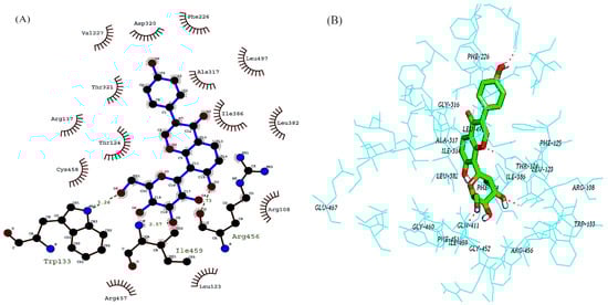 During docking, 50 conformations, one of which had the minimum energy of −7.57 kcal·mol−1, were selected. Cluster analysis disclosed that the most probable conformation had the energy of −7.3 kcal·mol−1, and 50% docked conformations were included, inferring that the docked structure was reliable and stable. The docking results were also visualized by Ligplus and Autodock (Figure 5).