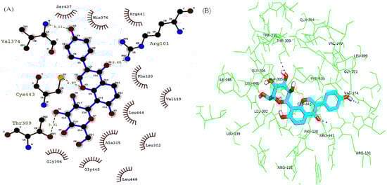 One out of the fifty conformations was of the minimum energy of −7.22 kcal·mol−1. Meanwhile, the binding affinity was predicted as ~μM. The results confirm that the docked structure was reliable and stable. The docking results were also visualized by Ligplus and Autodock (Figure 6).