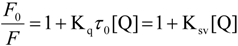 where F0 is the intensity without a quencher, Kq is the rate constant of bimolecular quenching, Ksv is the dynamic quenching constant, τ0 is the average lifetime of the emissive molecule without a quencher (biomacromolecules: 10−8 s), and [Q] is the concentration of the quencher. Plotting F0/F vs. [Q] indicates the types of quenching, i.e., a straight line for individual static or dynamic quenching, and an upward curve for mixed types [11].