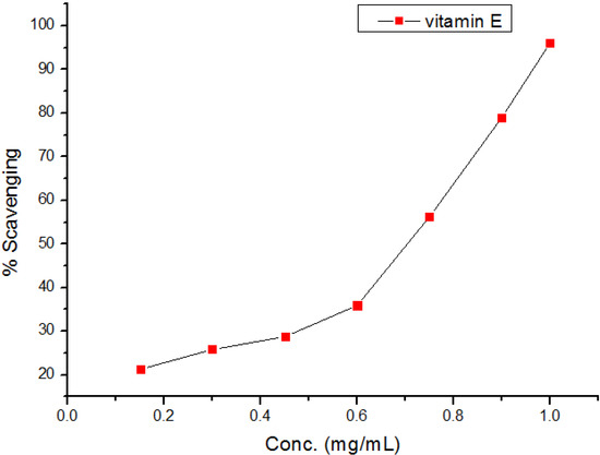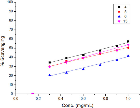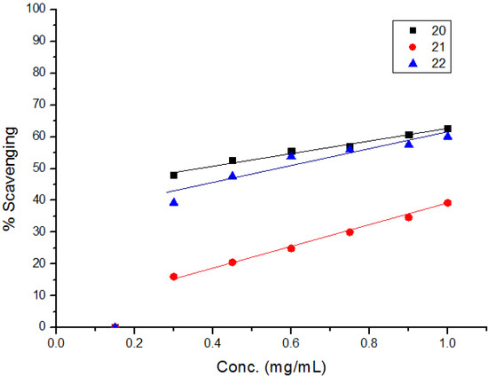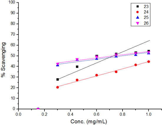 The diphenylpicrylhydrazyl (DPPH) assay method is based on the reduction of the free radical DPPH with an odd electron which gives a maximum absorption at 517 nm. When antioxidants react with DPPH, giving DPPD-H the absorbance decreases due to decolorization with respect to the number of electrons captured. EC50 values for each examined compound as well as standard preparations were calculated according to the method Shahwar et al. [26]. A lower EC50 value is associated with a higher radical scavenging activity. As shown in Table 1 and Table 2 and Figure 1, Figure 2, Figure 3, Figure 4, Figure 5 and Figure 6 the DPPH radical scavenging activities of the prepared compounds 1, 3c–e, 4–6, 13, and 16–26 in terms of EC50 values were the highest in the case of compounds 20, 3c, 3d, 1 and 22 (0.380, 0.418, 0.448, 0.590 and 0.590 mg, respectively) compared to the EC50 of vitamin E used as standard (0.705). Meanwhile nearly the same activities were revealed in case of compounds 23 and 26 (0.720 and 0.725 mg), respectively. In addition, moderate activities were shown for compounds 3e, 4, 17 and 25 (0.800, 0.800, 0.825 and 0.815 mg), respectively. Lower activities were observed in case of compounds 5, 6, 13, 16, 18, 19, 21 and 24 with EC50 values equal to 0.960, ˃ 1.000, 0.900, 0.980, ˃ 1.000, 0.930, ˃ 1.000, ˃ 1.000 mg, respectively, compared to the standard, see Table 2.