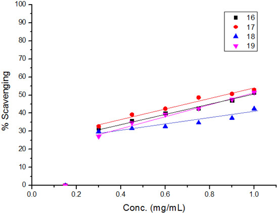 | Conc. (mg/ mL) | Compound 16 | Compound 17 | Compound 18 | Compound 19 | ||||