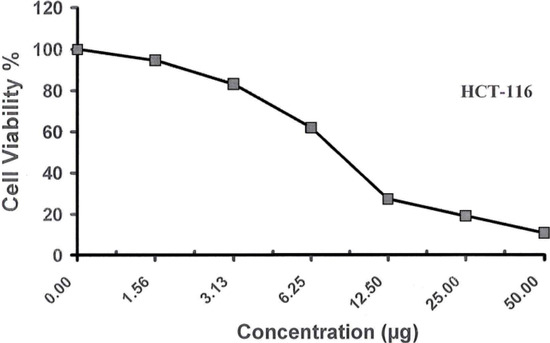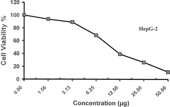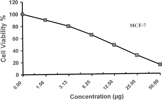 For the cytotoxicity assays, cells were seeded in 96-well plate at a cell concentration of 1 × 104 cell per well in 100 μL of growth medium. Fresh medium containing different concentrations of the test sample was added after 24 h of seeding. The microtiter plates were incubated at 37 °C in a humidified incubator with 5% CO2 for a period of 48 h. Three wells were used for each concentration of the tested sample. Control cells were incubated without test sample and with or without DMSO. After incubation of the cells for 24 h at 37 °C, various concentrations of the sample (50.000, 25.000, 12.500, 6.250, 3.125 and 1.560 μg) were added each separately. The incubation was continued for 48 h and viable cells yield was determined colorimetrically using 3,4,5-dimethylthiazol-2-yl-2,5-diphenyltetrazolium bromide (MTTB). The water insoluble tetrazolium salt is converted to purple formazan by the mitochondrial dehydrogenase of viable cells. After the end of incubation period, media were aspirated and crystal violet solution (1%) was added to each well for at least 30 min. The stain was removed and plates were rinsed using tap water until all excess stain is removed. Glacial acetic acid (30%) was then added to all wells and mixed thoroughly, then the absorbance of the plates were measured after gently shaken on Microplate Reader (Tecan, Inc., city, country), at 490 nm. All results were corrected for background absorbance detected in wells without added stain. Treated sample was compared with the cell control in the absence of the tested compound. All experiments were carried out in the triplicate. The cell cytotoxic effect of the tested compound was calculated [27,28].