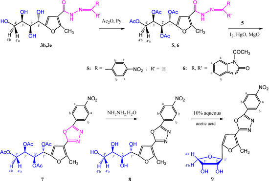 On the other hand, boiling of the tetrayltetraacetate 7 with hydrazine hydrate resulted in the corresponding tetrahydroxybutyl derivative 8 in 97% yield. Its IR spectrum showed the hydroxyl groups (OH) at γ 3387–3200 cm−1, while the corresponding 1H-NMR spectrum revealed the four hydroxyl protons at δ 5.23–4.37 ppm, and the mass spectrum showed the molecular ion peak in agreement with expected molecular weight of compound 8. Moreover, dehydrative cyclization of the tetraol derivative 8 with aqueous acetic acid (10%) afforded the aromatic C-nucleoside 9 in 63% yield, as detected from its spectral data. Its 1H-NMR spectrum (DMSO-d6) showed only two D2O-exchangeable hydroxyl protons for 2'-OH and 3'-OH, as two doublets at δ 5.16 and 5.03 ppm, respectively. The mass spectrum showed the expected molecular ion peak in agreement with its structure.