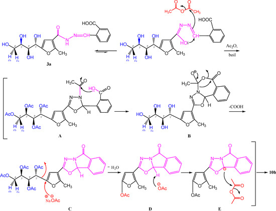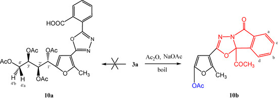 Condensative cyclization of carbohydrazone 3a with acetic anhydride in the presence of anhydrous sodium acetate gave a cyclized product that according to physical and chemical studies, could not be reconciled with the structure of 10a, that but rather was compatible with that of [1,3,4]oxadiazolo-[2,3-a]isoindole 10b. The infrared spectrum of this compound showed the disappearance of the carboxylic acid hydroxyl group, sugar hydroxyl groups, and CONH absorption bands. It showed instead an acetoxyl (OAc) group at γ 1,744 cm−1 and carbonyl groups at γ 1,725 and 1,712 cm−1. Its 1H-NMR spectrum (CDCl3) showed the disappearance of signals corresponding to the sugar protons at the δ 3.00–5.00 ppm region, and only displayed the aromatic protons as a doublet at δ 7.84 (J = 7.65 Hz) for Ar-H(a), a triplet at δ 7.65 (J = 7.65 Hz) for Ar-H(b), a triplet at δ 7.56 (J = 7.65 Hz) for Ar-H(c), and a doublet at δ 7.53 (J = 7.65 Hz) for Ar-H(d), followed by a singlet attributed to CH(furan) at δ 7.00 ppm. Three singlet signals that appeared in the upper field region at δ 2.56, 2.27 and 2.14 ppm were attributed to the CH3(furan), COCH3 and O-acetyl protons, respectively. It is noteworthy that the integration of the OAc protons (δ 2.14 ppm), indicated only one O-acetyl group, in accord with structure 10b. Moreover, the proposed mechanism for formation of 10b may proceed as illustrated in Scheme 3 and Scheme 4.