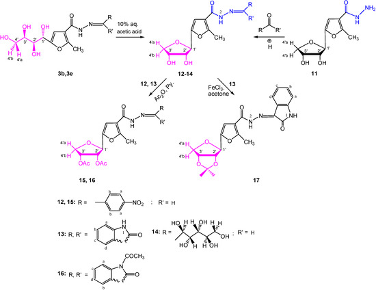 Method B. A solution of 5-(2',3'-dihydroxytetrahydrofuran-1'-yl)-2-methylfuran-3-carbohydrazide (11) [4] in ethanol containing a few drops of acetic acid was treated with carbonyl compound, and the reaction mixture was refluxed on water bath for 30 min. After cooling the 3-carbohydrazones 12–14 that separated out were filtered off, washed with a little ethanol, and dried.
