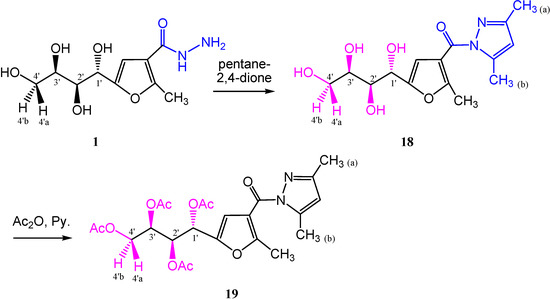 The pyrazole derivative 18 was obtained in 100% yield from the reaction of carbohydrazide 1 with pentane-2,4-dione as previously reported on other systems [23]. The infrared spectrum showed the disappearance of absorption bands corresponding to NH and NH2. Its 1H-NMR spectrum (DMSO-d6), revealed three singlets at δ 6.18, 2.48 and 2.16 ppm for CH(pyrazole), CH3(pyrazole-a) and CH3(pyrazole-b) protons, respectively. The molecular ion peak recorded in the mass spectrum was in accordance with its molecular weight. Furthermore, the O-acetyl derivative 19 was prepared, in which the signals of the sugar protons of this product were assigned from its 2D 1H-NMR spectrum (Scheme 6).