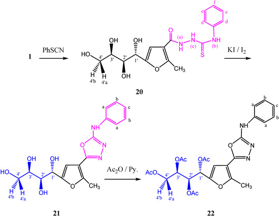 1-(5-(1',2',3',4'-Tetrahydroxybutyl)-2-methylfuran-3-carbo-3-yl)-4-phenyl thiosemicarbazide (20) [24]. A mixture of 5-(1',2',3',4'-tetrahydroxybutyl)-2-methylfuran-3-carbohydrazide 1 (3.846 mmoL) and phenyl isothiocyanate (3.846 mmoL) are heated under reflux in ethanol (10 mL) for 2 h. After cooling the thiosemicarbazide that separated was filtered off, washed with little ethanol, and dried. Yield (100%); recrystallized from ethanol as white crystals; mp 133–134 °C; Rf: 0.35 (chloroform–methanol; 5:1; v/v); IR(KBr) cm−1: 3415–3264 (OH, 3NH), 1659 (CO); 1H-NMR (DMSO-d6); δ: 2.47 (s, 1H, CH3-furan with DMSO), 3.34–3.41 (m, 1H, H-4'b), 3.45–3.48 (m, 1H, H-4'a), 3.50–3.57 (m, 2H, H-3', H-2'), 4.34 (t, 1H, 4'-OH, J4',OH = 6.15 Hz, D2O-exchangeable), 4.42 (d, 1H, 3'-OH, J3',OH = 6.85 Hz, D2O-exchangeable), 4.59 (d, 1H, 2'-OH, J2',OH = 6.15 Hz, D2O-exchangeable), 4.73 (d, 1H, H-1', J1',2' = 7.65 Hz), 5.12 (d, 1H, 1'-OH, J1',OH = 8.40 Hz, D2O-exchangeable), 6.72 (s, 1H, CH (furan)), 7.11 (t, 1H, Ar-H(f), J = 8.40 Hz), 7.28 (t, 2H, Ar-H(e), J = 9.15 Hz), 7.42 (bs, 2H, Ar-H(d)), 9.54 (s, 1H, NH(c), D2O exchangeable), 9.72 (s, 1H, NH(b), D2O exchangeable), 9.97 (s, 1H, NH(a), D2O exchangeable); Anal. Calcd for C17H21N3O6S: C, 51.64; H, 5.35; N, 10.63%; found: C, 51.70; H, 5.20; N, 10.60%.