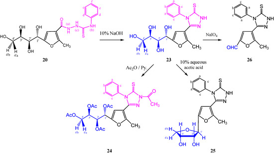 Alternatively, heating the thiosemicarbazide 20 with aqueous sodium hydroxide (10%) [25] gave a product 23, whose infrared spectrum showed a C=N absorption at γ 1,624 cm−1 with the disappearance of the CONH absorption. Moreover, acetylation of 23, gave 5-(5-(1',2',3',4'-tetraacetoxybutyl)-2-methylfuran-3-yl)-4-phenyl-2-N-acetyl-1,2,4-triazole-3(4H)-thione (24) in 97% yield. The 1H-NMR spectrum (CDCl3) revealed the disappearance of the NH proton and showed a singlet due to N-acetyl protons at δ 2.77 ppm, followed by three singlets at δ 2.01, 1.99, and 1.97 ppm for four O-acetyl groups. The mass spectrum showed a molecular ion peak in accordance with its molecular formula (Scheme 8).