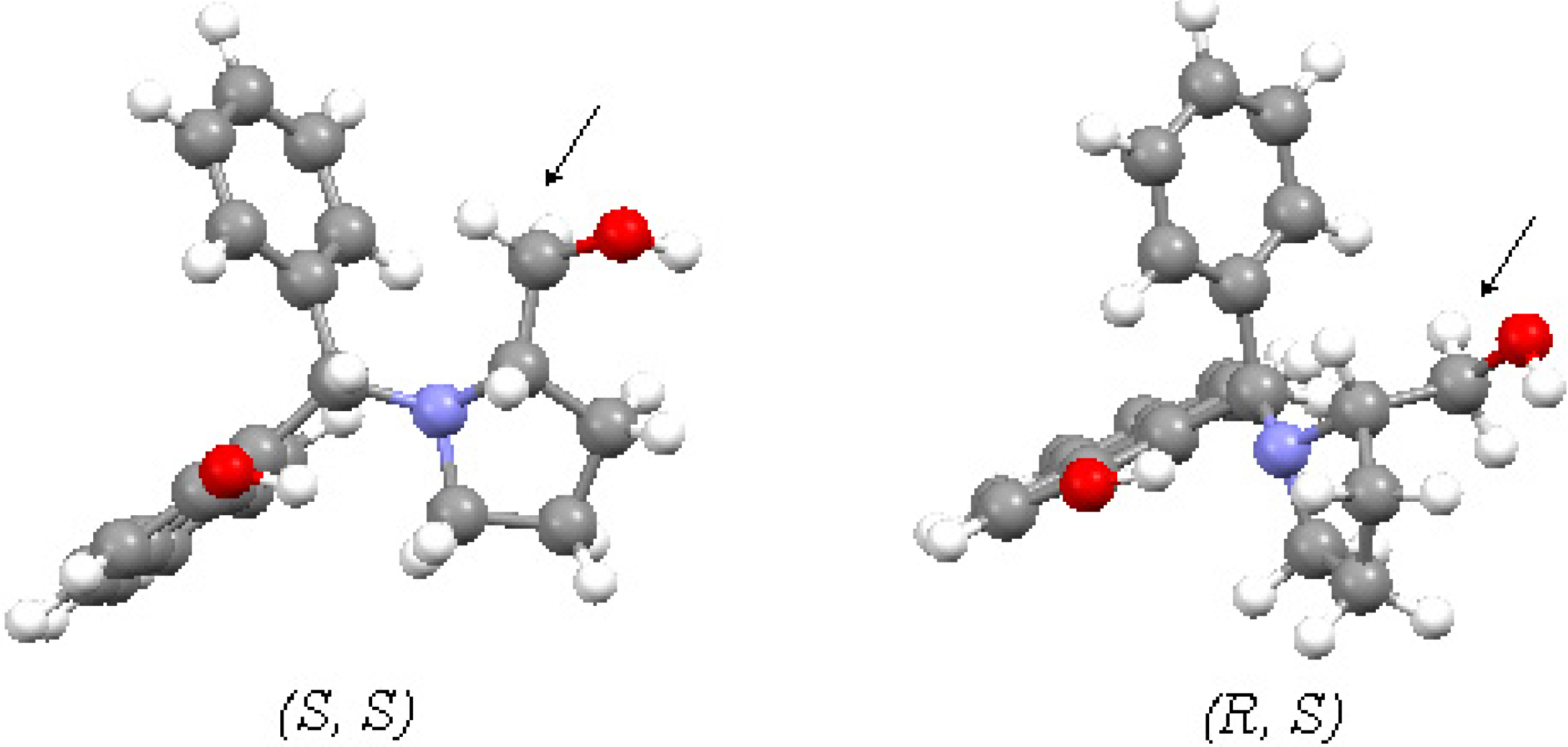 3.2.2. 1-[(2-Hydroxymethyl-pyrrolidin-1-yl)-benzyl]-naphth-2-ols 7 and 8—Predominant Stereoisomer