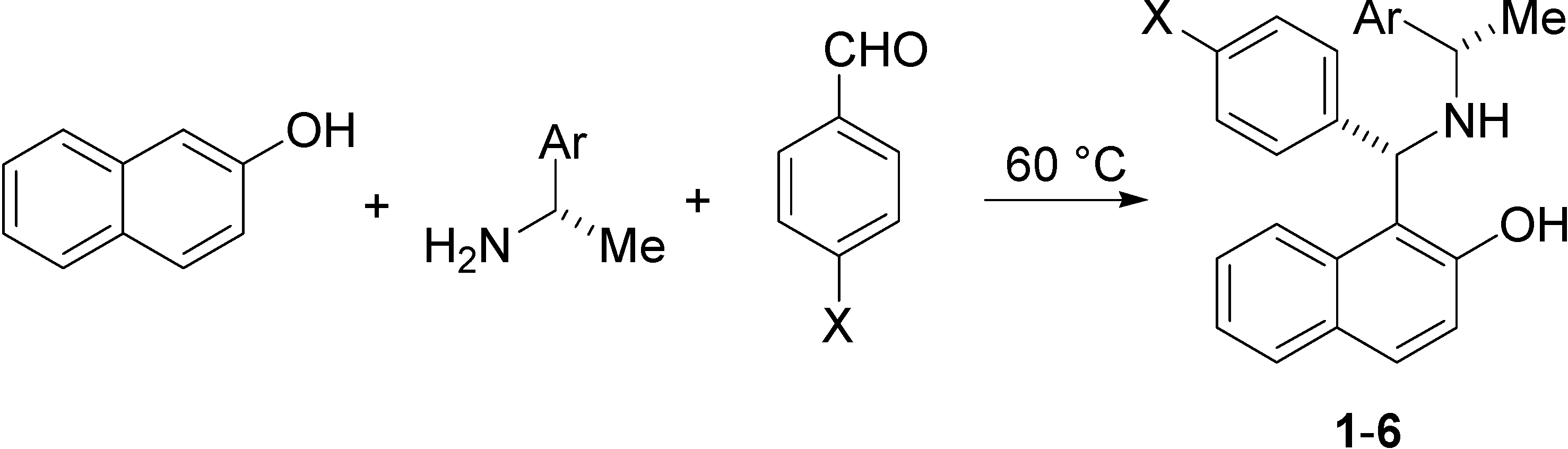 - Cardellicchio, C.; Ciccarella, G.; Naso, F.; Schingaro, E.; Scordari, F. The Betti base: Absolute configuration and routes to a family of related chiral nonracemic bases. Tetrahedron: Asymmetr. 1998, 9, 3667–3675. [Google Scholar] [CrossRef]