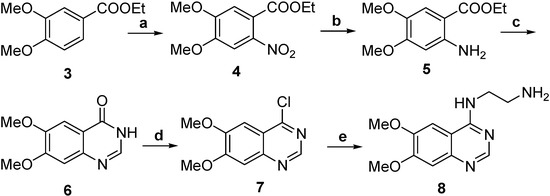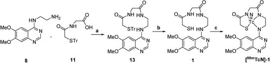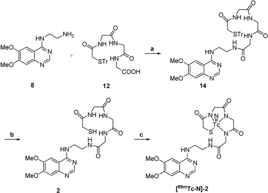 The synthesis of 4-(2-aminoethylamino)-6,7-dimethoxyquinazoline was carried out using the procedure shown in Scheme 1. A solution of compound 3 in AcOH was added to nitric acid solution under stirring at 0–5 °C for 30 min and then at room temperature for 24 h to obtain 4. Compound 4 was hydrogenated with Pd/C in methanol at room temperature to obtain 5. Compound 5 was reacted with formamide at 165–170 °C under N2 to obtain 6, which was treated with thionyl chloride and DMF to get chloro derivative 7 and then 7 coupled with ethylenediamine in i-PrOH at 80 °C to obtain 8. The synthesis of compounds 9–12 is shown in Scheme 2. Compound 9 in which the thiol group was protected by trityl chloride in advance was reacted with N-hydroxysuccinimide (NHS) using dicyclohexylcarbodiimide (DCC) as condensation reagent to obtain the active ester 10. The active ester 10 was reacted with the amine group of glycine to provide the Tr-MAG (11).