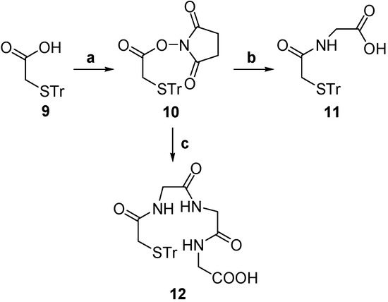 Tr-MAG3 (12) was synthesized by the same procedure as 11, except using triglycine instead of glycine. Tr-MAG (11) was conjugated with compound 8 with DCC as condensation agent and 4-dimethylaminopyridine (DMAP) as nucleophilic agent to provide the compound 13. Tr-MAG3 (12) was conjugated with compound 8 under the same conditions to give compound 14. Next, the thiol groups were deprotected in trifluoroacetic acid (TFA) to obtain 1. Compound 2 was prepared using the same method as product 1.