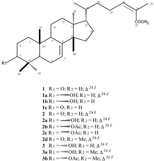 3.3. Extraction and Isolation of Natural Triterpenoids 1–3