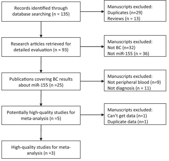 Wang, F.; Hou, J.; Jin, W.; Li, J.; Yue, Y.; Jin, H.; Wang, X. Increased Circulating MicroRNA-155 as a Potential Biomarker for Breast Cancer Screening: A Meta-Analysis. Molecules 2014, 19, 6282-6293. https://doi.org/10.3390/molecules19056282