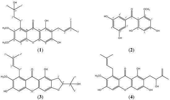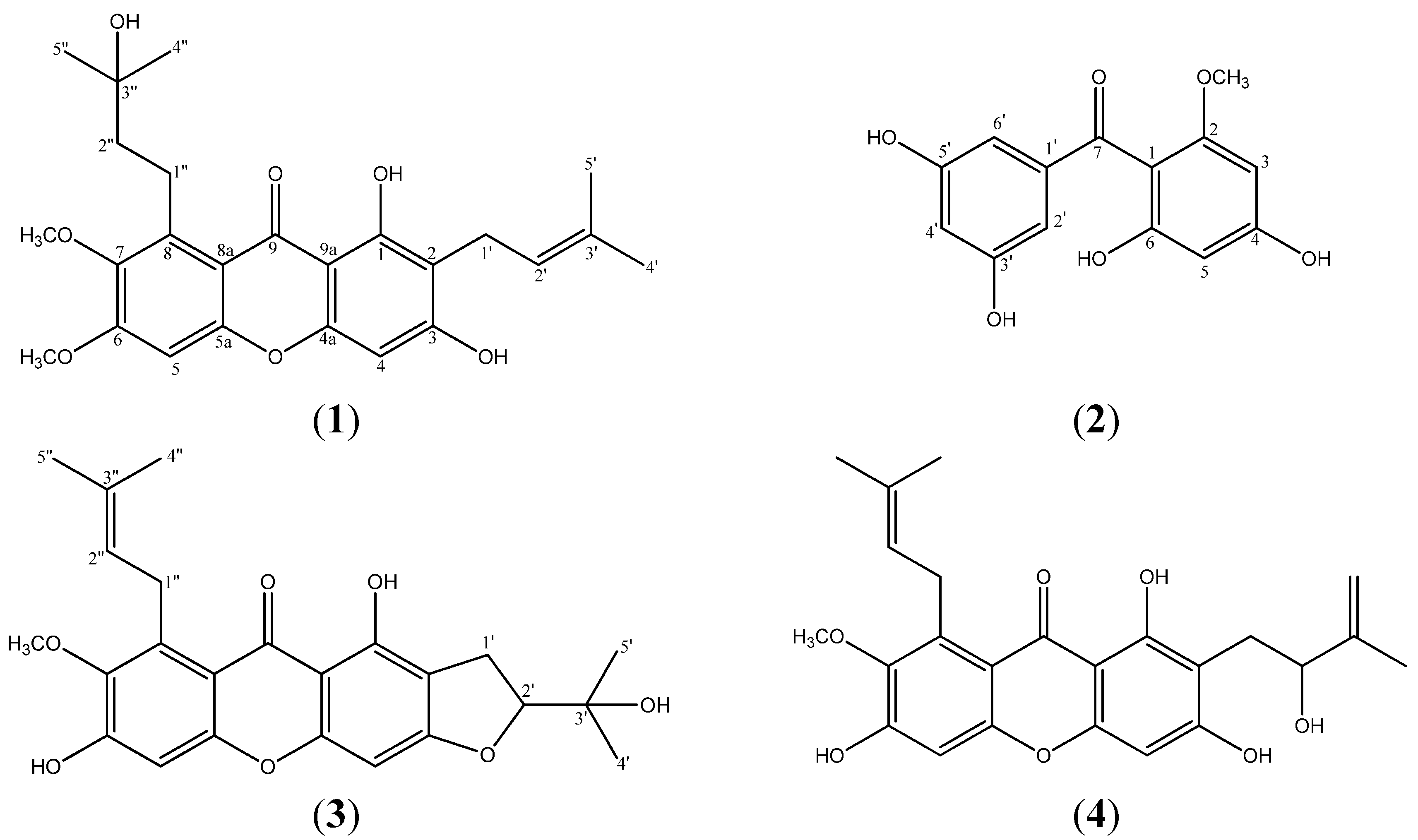 The Clusiaceae family consists of approximately 40 genera [1], including Garcinia, Mesua and Cratoxylum [2]. Some Clusiaceae plants are used in traditional medicine to treat various illnesses. For example, Garcinia schomburgkianaPierre is used to treat coughs and menstrual problems [3] while Mesua ferrea is used in the treatment for dyspepsis and renal disease [4]. Clusiaceae plants contain numerous biologically active secondary metabolites, such as benzophenones, xanthones, coumarins and flavonoids. The pharmacological properties of these secondary metabolites include antifungal activity in Calophyllum thwaitesii [5], antioxidant activity in Cratoxylum cochinchinense [6], antimicrobial and antibacterial activities in Garcinia cowa [7] and anticancer activity in Garcinia paucinervis [8]. Garcinia plants are mainly found in tropical countries such as Malaysia, Thailand and Brazil [1]. Garcinia plants are currently being more avidly studied due to their abilities to treat dysentery, pain, tapeworm infestations and many more ailments [9]. Being a member of the Garcinia genus, the mangosteen is also well known to be a rich source of xanthones and benzophenones, especially polyprenylated xanthones and oxygenated xanthones [10]. These secondary metabolites have been reported to possess biological properties against fungi [11], bacteria [12,13] and also cancer [14,15]. Ryu and co-workers also reported that some oxygenated xanthones from the seedcases of this plant possess neuraminidase inhibitory activity [16]. The discoveries of these beneficial secondary metabolites have revitalized our interest to investigate more extensively on the stem bark of Garcinia mangostana. Herein, we describe the isolation as well as the characterization of a new prenylated xanthone, mangaxanthone B (1) and a new benzophenone, mangaphenone (2), along with two other known xanthones mangostanin (3) and mangostenol (4).