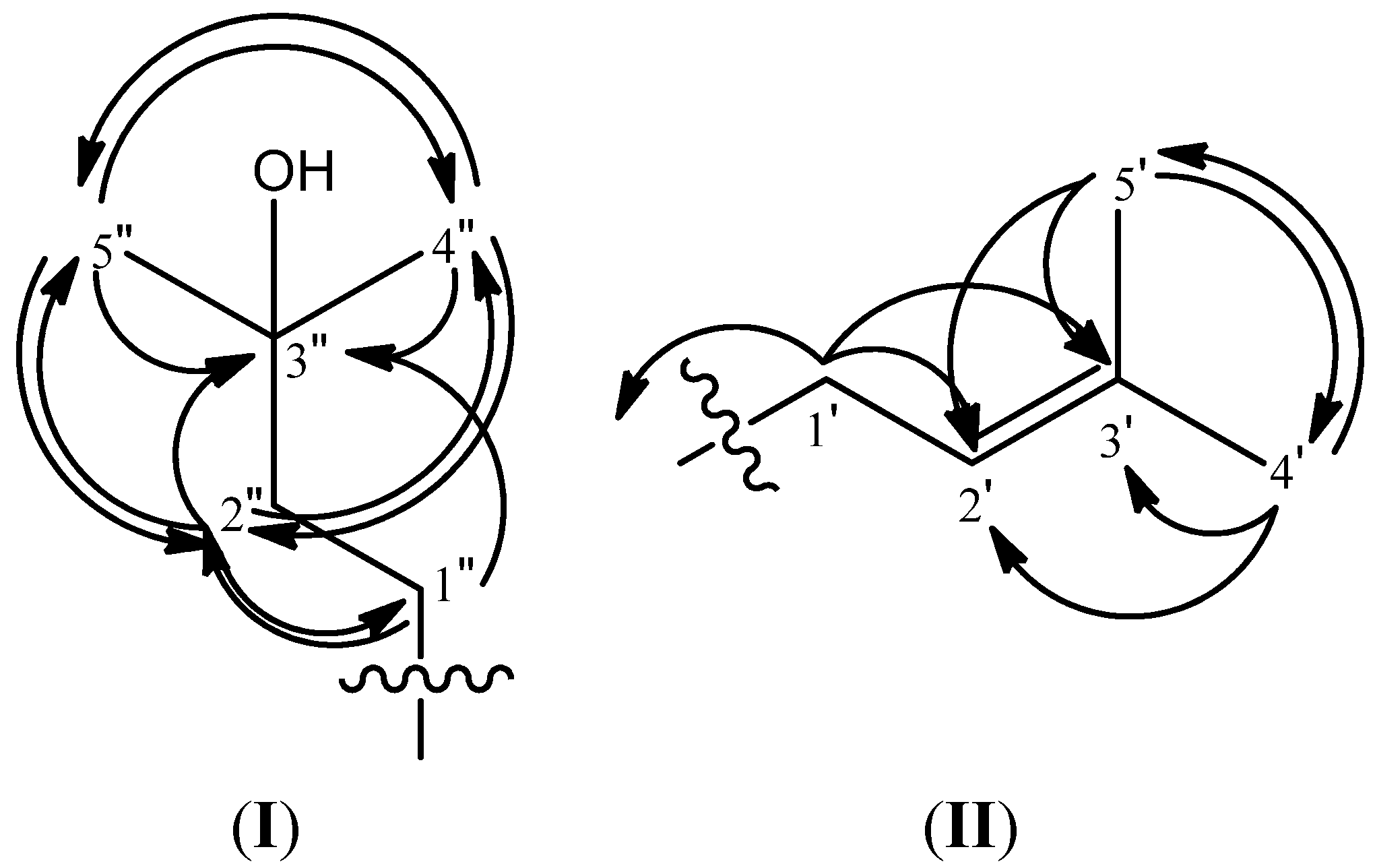 The HMBC correlation of 3-hydroxy-3-methylbutyl (I) and prenyl (II) moieties in compound 1.