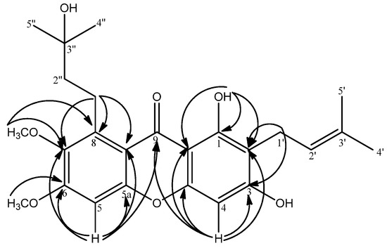A pair of overlapping aliphatic methyls [δH 1.28 (s, 6H, H-4'', H'')] gave clear correlations with C-2'' (δC 44.9) and C-3'' (δC 69.7) indicating the methyls to be attached to C-3''. H-2'' [δH 1.70 (m, 2H)] gave cross peaks to C-4''(δC 28.5), C-5'' (δC 28.5), C-3'' (δC 69.7) and C-1'' (δC 22.2). Meanwhile H-1'' [δH 3.42 (m, 2H)] showed a 2J correlation with C-2'' (δC 44.9) and a 3J correlation with C-3'' (δC 69.7). These long range correlation signals allow us to conclude a 3-hydroxy-3-methylbutyl moiety (Figure 2). The coupling of H-1'' and H-2'' was seen in the COSY experiment. Moreover, the cross peaks of H-1'' [δH 3.42 (m, 2H)] to C-7 (δC 144.1), C-8 (δC 138.4), C-8a (δC 111.4) and the cross-peak of H-2'' [δH 1.70 (m, 2H)] to C-8 (δC 138.4) in the HMBC analysis were suggestive of the 3-hydroxy-3-methylbutyl moiety location at C-8. In addition, the two aromatic methoxyl groups [6-OCH3 (δH 4.00) and 7-OCH3 (δH 3.79)] are assigned at C-6 and C-7 because of their 3J correlations with δC 158.6 (C-6) and δC 144.1 (C-7). The two remaining aromatic methine protons of the xanthone skeleton were determined to be at the two remaining available carbons, C-4 and C-5. The long range correlations between H-4 (δH 6.38) and C-2 (δC 110.3), C-3 (δC 162.2), C-4a (δC 154.9), C-9 (δC 182.0) and C-9a (δC102.9) places the δH 6.38 (H-4) singlet at C-4. The signal at δH 6.90 (H-5) was assigned to C-5 based on its HMBC correlations with C-5a (δC 155.4), C-6 (δC 158.6), C-7 (δC 144.1), C-8 (δC 138.4), C-8a (δC 111.4) and C-9 (δC 182.0). Compound 1 differs from a closely related compound, garcinone D [17] in the presence of a methoxyl group at C-6 where garcinone D has a hydroxyl group at that position. The methoxyl group in compound 1 was assigned from the observation of a HMBC correlation between 6-OCH3 (δH 4.00) and C-6 (δC 158.6). The HMBC correlations are illustrated in Figure 3. Therefore, compound 1 was elucidated to be 1,3-dihydroxy-8-(3-hydroxy-3-methylbutyl)-6, 7-dimethoxy-2-(3-methyl-2-buten-1-yl)-xanthone and it was named trivially as mangaxanthone B.
