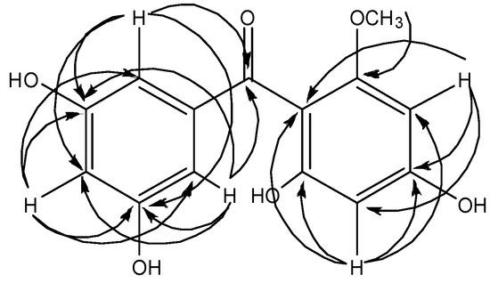 The structure of compound 2 was deduced based on the HMBC spectrum (See Figure 4). The aromatic protons at H-2' and H-6' [δH 6.52 (d, 2H, J = 2.3 Hz)] showed three-bond connectivities with, C-4' (δC 105.7), and C-7 (δC 198.4). Protons H-2' and H-6' also gave two-bond connectivities with C-3' and C-5' (δC 158.0 × 2) respectively. Meanwhile H-4' has 2J correlations with C-3' and C-5' (δC 158.0 × 2) and 3J correlations with C-2' and C-6' (δC 106.5 × 2). The aromatic proton of H-3 [δH 5.96 (s, 1H)] exhibited three-bond (3J) and two-bond (2J) connectivities with C-1 (δC 106.4) (3J), C-5 (δC 95.3) (3J) and C-4 (δC 163.3) (2J) respectively. H-5 [δH 5.96 (s, 1H)] also showed correlations with C-1 (δC 106.4) (3J), C-3 (δC 91.1) (3J), C-4 and C-6 (δC 163.3 × 2) (2J) in the HMBC spectrum. Moreover, the methoxyl group was assigned to C-2 because of the 3J HMBC correlation of the methoxyl proton [δH 3.54 (s, 3H, 2-OCH3)] with C-2 (δC 161.5). The observation of a 2J correlation between H-3 and C-4 implies position 3 to be occupied by H-3. Moreover, we also observed a 2J correlation between H-5 and C-6 as well as between H-5 and C-4. Therefore, another proton is situated at C-5. 4-OH and 6-OH carbons have the same chemical shift values, thus justifying that the molecule is symmetrical. Hence, the two OH groups are at C-6 and C-4 and not at C-2. Hence, the structure of this compound was elucidated as (4,6-dihydroxy-2-methoxyphenyl)-(3,5-dihydroxyphenyl)methanone and it was given the trivial name mangaphenone.