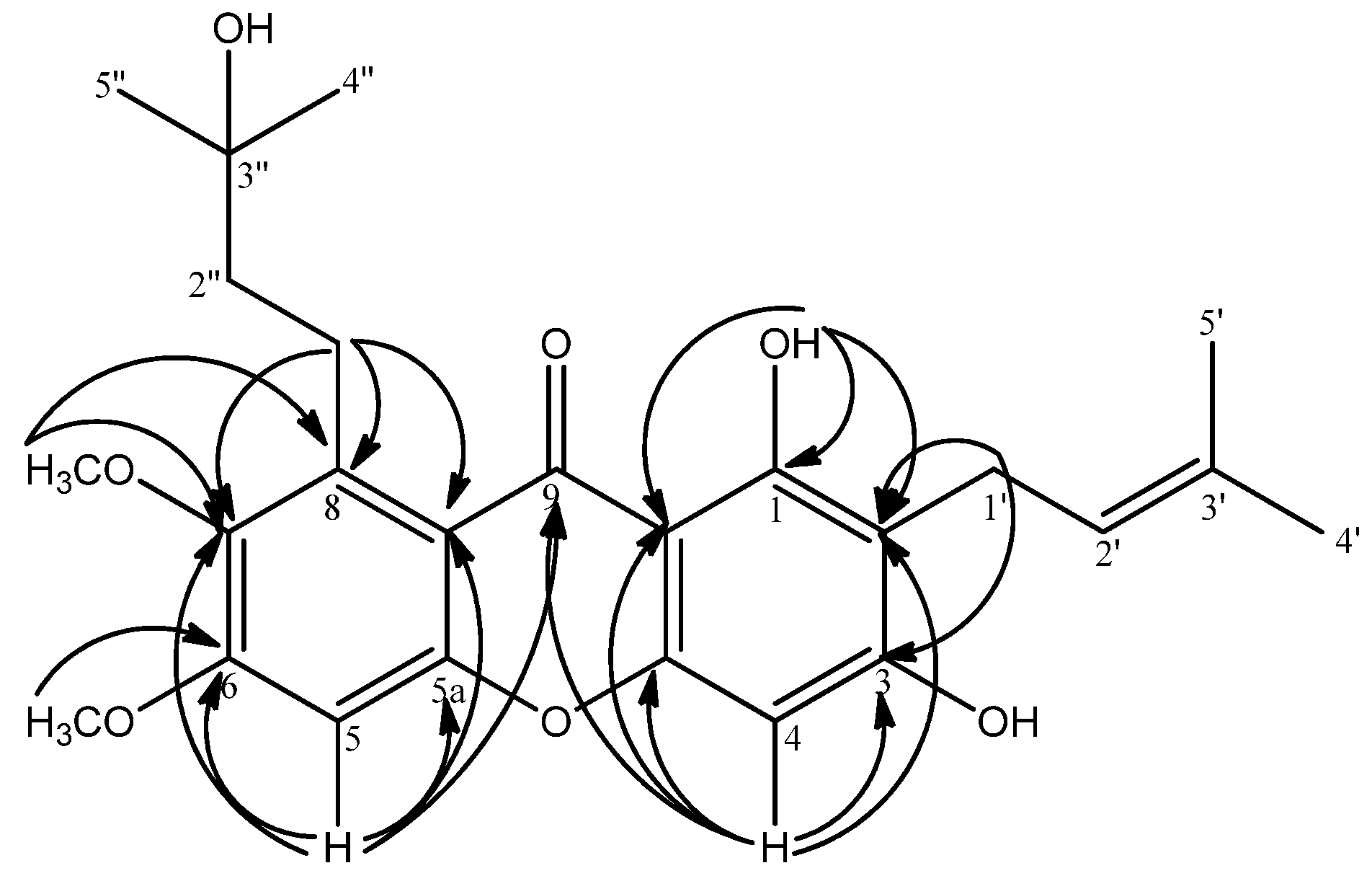- Udomchotphruet, S.; Phuwapraisirisan, P.; Sichaem, J.; Tip-pyang, S. Xanthones from the stems of Cratoxylum cochinchinense. Phytochemistry 2012, 73, 148–151. [Google Scholar]